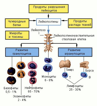 Факторы, стимулирующие лейкопоэз: Т — тимусзависимые лимфоциты (клетки-киллеры, клетки-хелперы и супрессоры); В — бурзависимые лимфоциты (производящие антитела).