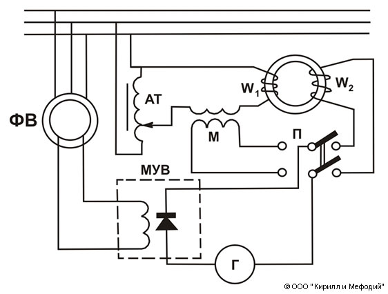 Принципиальная электрическая схема феррометра: Г — магнитоэлектрический гальванометр; МУВ — механически управляемый выпрямитель; ФВ — фазовращатель; П — переключатель; w1 — намагничивающая катушка; w2 — измерительная катушка; М — катушка взаимной индуктивности; АТ — автотрансформатор.