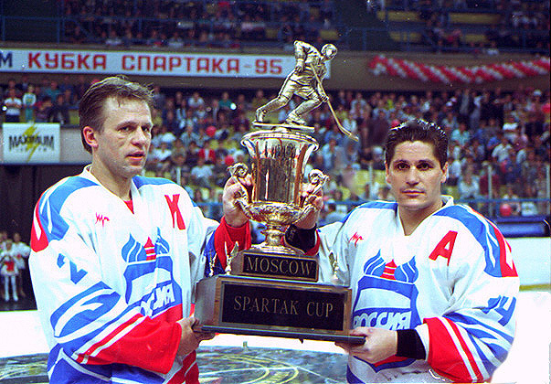 В. Фетисов, капитан сборной «Звезды России», и нападающий С. Макаров — победители Международного хоккейного турнира на Кубок «Спартака». 1995.