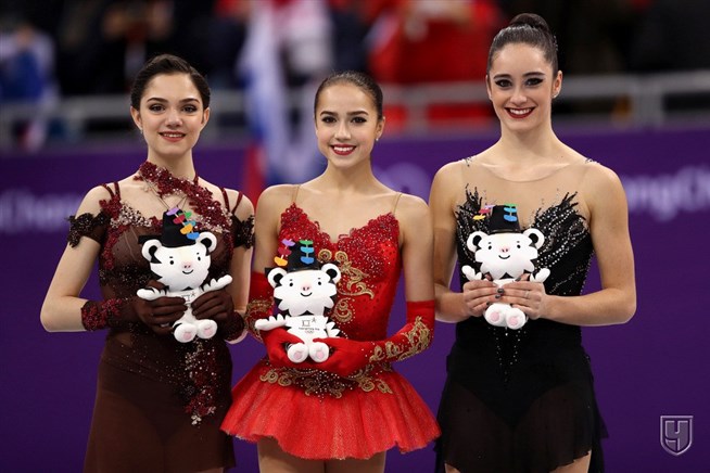 Алина Загитова (Россия), Евгения Медведева (Россия) и Кейтлин Осмонд (Канада). Пхёнчхан. 23 февраля 2018 г. Фото: Gettyimages.com