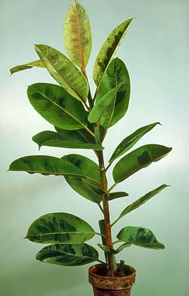 Декоративный сорт фикуса эластичного с мраморной окраской листьев.