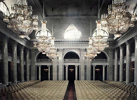 Большой зал Петербургской филармонии имени Шостаковича. Филармония занимает здание бывшего Дворянского собрания, построенного в 1834-1839 годах архитектором П. Жако по проекту К. И. Росси. Большой зал, декорированный коринфскими колоннами, имеет высокое качество акустики. Здесь еще до революции 1917 года начали исполняться симфонические произведения. Например, в Большом зале Дворянского собрания была впервые исполнена Шестая симфония П. И. Чайковского. В предвоенные годы Ленинградская филармония была тесно связана с деятельностью музыковеда И. И. Соллертинского, увековеченного устными рассказами И. Л. Андроникова.