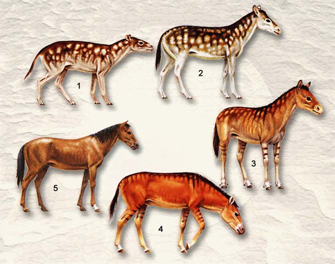 Филогенетические ряды представляют собой реконструкцию последовательно сменявших друг друга форм от вымерших предков до ныне живущих потомков через ряд промежуточных форм. Филогенетический ряд лошади: 1 — гиракотерий, 2 — мезогиппус, 3 — меригиппус, 4 — плиогиппус, 5 — эквус.