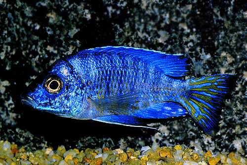 Фиолетовая аулонокара (Aulonocara stuartgranti). Самец ярко-синего окраса с оранжево-желтыми линиями на плавниках.