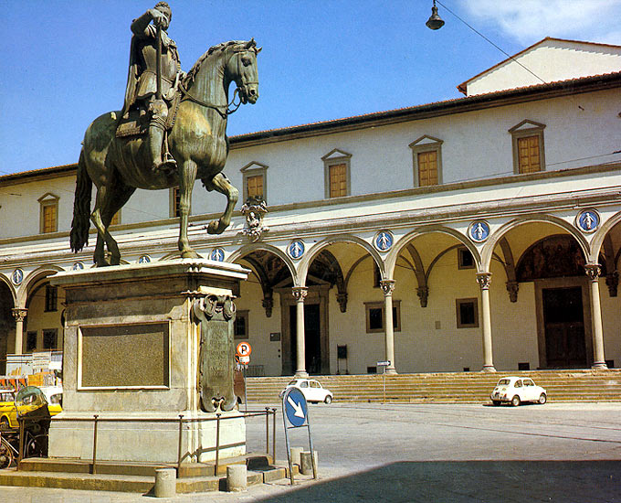 Воспитательный дом во Флоренции (1421-1444), архитектор Филиппо Брунеллески. Слева конная статуя Фердинанда I Медичи. Архитектура выдержана в античных традициях; здание символично началу эпохи Возрождения.