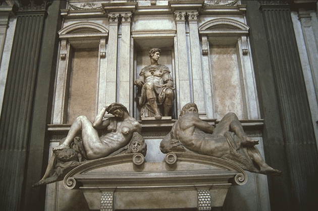 Микеланджело. Капелла Медичи. Гробница Джулиано Медичи (1526-33), украшенная символическими фигурами «Дня» и «Ночи».