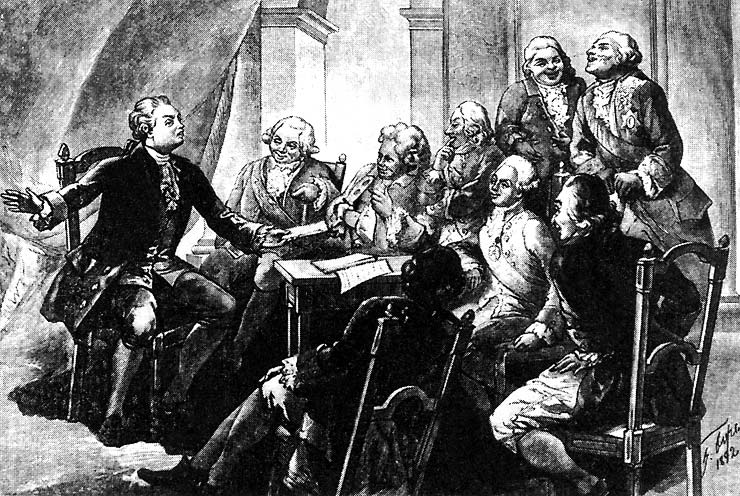 Д.И. Фонвизин читает свою комедию «Бригадир» в салоне цесаревича Павла Петровича.