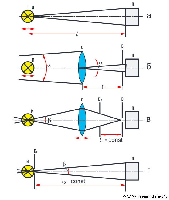 Принципиальные оптические схемы фотометров для измерения: а — освещенности и экспозиции, а также (с привлечением закона квадратов расстояний) силы света и освечивания; б — силы света и освечивания (т. н. телецентрическим методом); в — яркости и интеграла импульса яркости (с применением фокусирующей оптической системы); г — яркости (с применением габаритной диафрагмы). И — источник света; П — приемник излучения с исправляющими его спектральную чувствительность светофильтрами и ослабителями; О — объектив с фокусным расстоянием f; D — диафрагма, устанавливаемая в фокальной плоскости (б) или в плоскости изображения источника (в); Da — апертурная диафрагма; Dr — габаритная диафрагма; α и β — угловые размеры фотометрируемых пучков лучей.