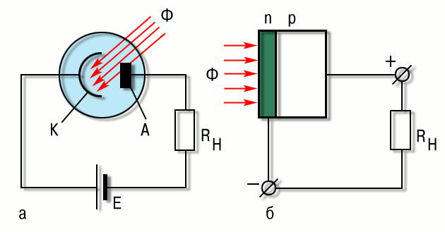 Схема электровакуумного (а) и полупроводникового (б) фотоэлемента: К — фотокатод; А — анод; Ф — световой поток; n и p — области полупроводника с донорной и акцепторной примесями; Е — источник постоянного тока; Rн — нагрузочный резистор.