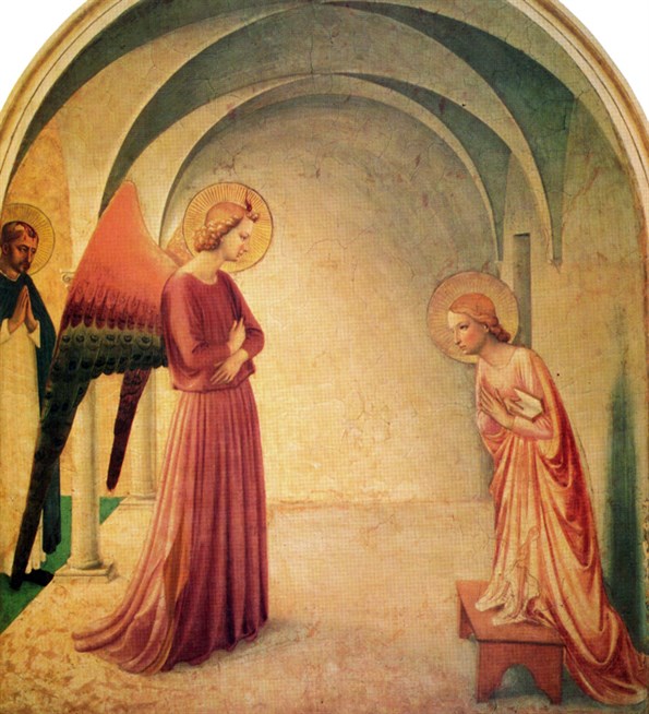 Фра Анджелико. Благовещение. 1441-1443 годы. Фреска. Монастырь Сан-Марко, Флоренция. Фреска была написана на стене кельи художника. Слева от архангела Гавриила — мученик Петр.
