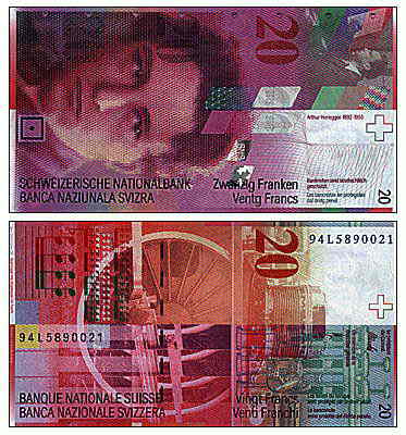 Двадцать швейцарских франков. 148 x 74 мм. 1996 г.