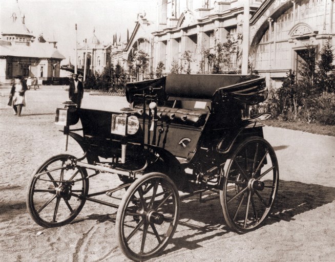 Первый русский автомобиль Яковлева и Фрезе на фоне центрального павильона Нижегородской ярмарки. 1896 год. Фотография Максима Дмитриева.