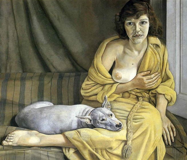 Люсьен Фрейд (1922-2011). Девушка с белой собакой. 1951-1952 годы. Галерея Тейт, Лондон. На картине изображена первая супруга художника и ее бультерьер. В 1948 году Люсьен Фрейд, внук психоаналитика Зигмунда Фрейда, женился на Китти Гарман (1926-2011), дочери скульптора сэра Джейкоба Эпштейна (1880-1959). В браке родились две дочери, но супруги расстались в 1952 году.