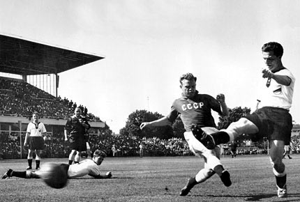 Острый момент олимпийского турнира по футболу в матче СССР-Югославия. Мельбурн (1956).