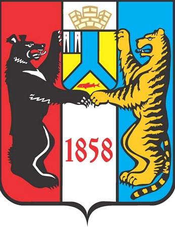 Герб Хабаровска, принятый 13 августа 1991 года. Щит французской формы разделен вертикально на три равные части цветов государственного флага России. В правой и левой части стоящие на задних лапах, фигуры белогрудого медведя и уссурийского тигра с червлеными глазами и языками поддерживают прежний герб Хабаровска. В нижней части щита дата образования города — 1858.