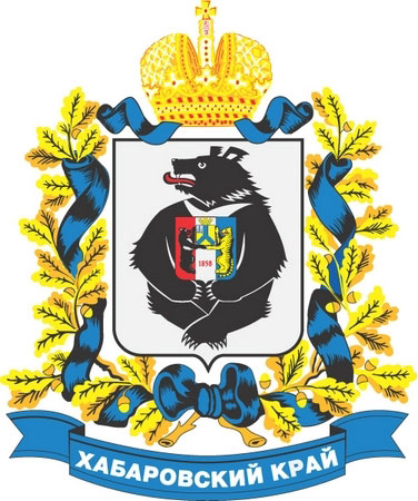 Полный герб Хабаровского края (утвержден 28 июля 1994). В центре щита сидящий на задних лапах черного цвета белогрудый медведь, который передними лапами удерживает герб Хабаровска. Полный (большой, парадный) герб увенчан короной, по сторонам щита изображены золотом дубовые ветви с желудями, перевитые андреевскою (лазоревого цвета) лентою. Малый герб — изображение только фигуры медведя.