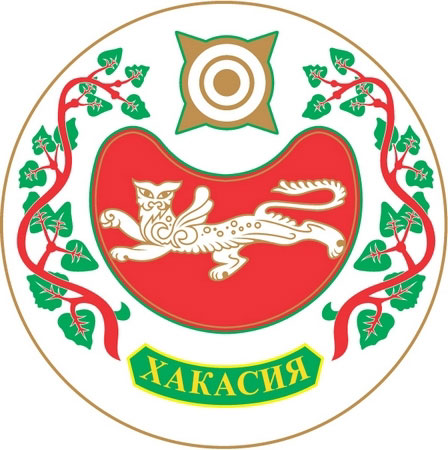 Герб Хакасии, принятый 14 июня 2001 года. На овальном с выемкой в верхней части красном геральдическом щите изображен крылатый снежный барс белого цвета с темными пятнами на спине и приподнятой передней правой лапой. Щит обрамлен березовыми ветвями с зелеными листьями. В основании обрамления в зеленом шестиугольнике надпись «Хакасия», в верхней разомкнутой части обрамления — солярный знак. Надпись и солярный знак золотого цвета.