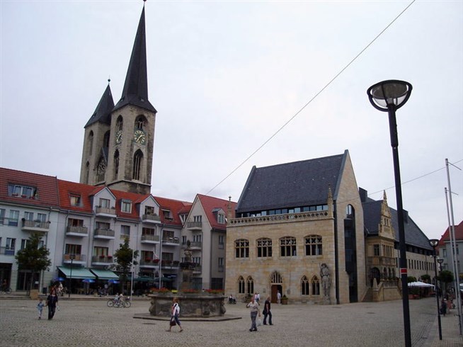 Хальберштадт. Городская ратуша (боковой фасад). У ее стены — статуя Роланда. На заднем плане — башни церкви Мартиникирхе.