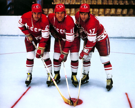 Прославленная тройка ЦСКА, которая в том же составе неоднократно выступала и за сборную СССР: Борис Михайлов, Владимир Петров, Валерий Харламов.