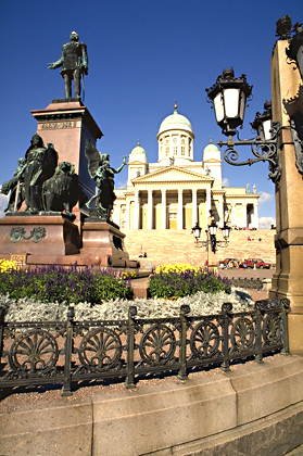Хельсинки. На Сенатской площади (главной площади Хельсинки) на переднем плане: памятник Александру II, на заднем — Лютеранский кафедральный собор.
