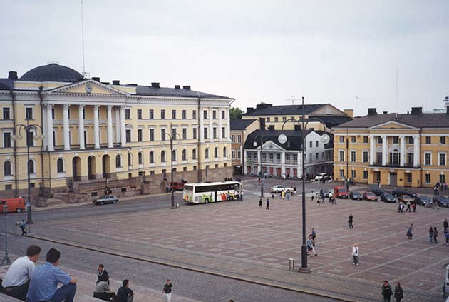 Хельсинки. Сенатская площадь — главная в Хельсинки. Это исторический центр города. Слева на фото Государственный совет. Его здание было построено в 1822 году для сената — высшего органа самоуправления Великого княжества Финляндского. Справа Старая ратуша, возведенная в начале 19 века. Оба здания построены в стиле классицизм.