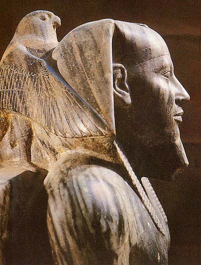 Голова Хефрена защищена раскрытыми крыльями бога Гора — легендарного прародителя фараонов Египта. Диорит. IV династия. 27 в. до н.э. Египетский музей. Каир.