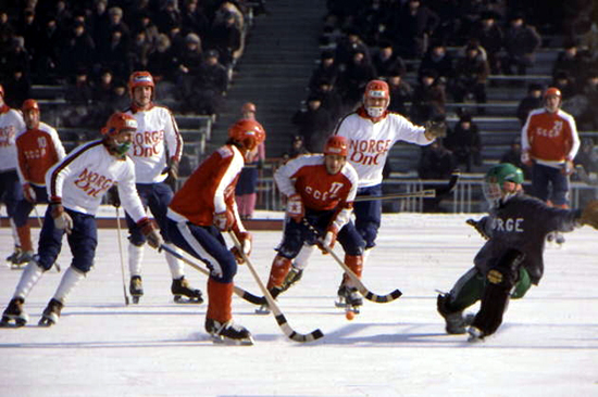 Острый момент в матче СССР-Норвегия, мировых лидеров хоккея с мячом.