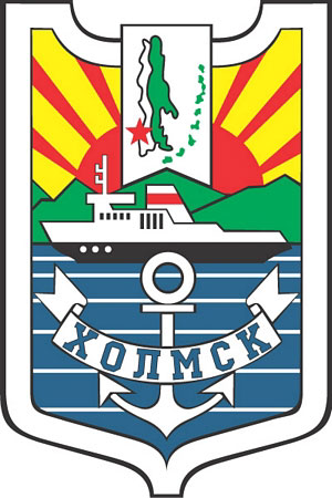 Герб Холмска, принятый 13 апреля 1972 года. В верхнем поле червленое солнце, восходящее из-за зеленых холмов. Поверх всего укороченный серебряный столб с графическим изображением Сахалина и Курильских островов. В нижнем лазуревом поле с серебряными поясами — серебряный якорь, поверх которого лента с наименованием города, сопровождаемый вверху стилизованным серебряно-черным паромом.