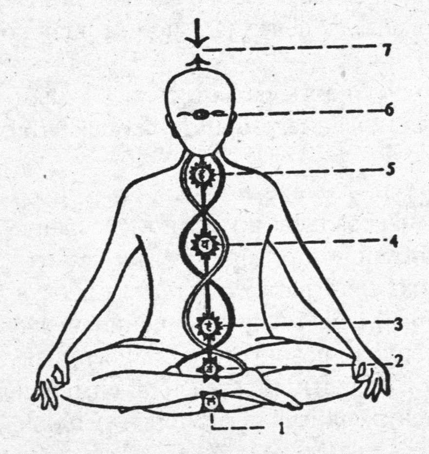 Чакры — центры тонкого тела человека: 1 — Муладхара; 2 — Свадхистана; 3 — Манипура; 4 — Анахата; 5 — Вишудха; 6 — Аджна; 7 — Сахасрара