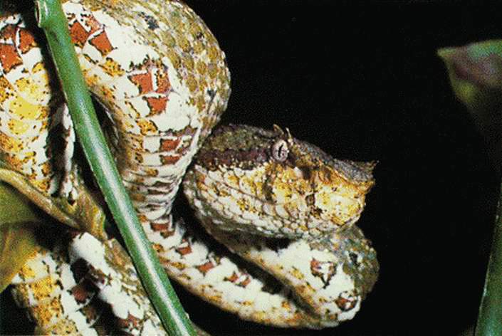 Цепкохвостый ботропс (Bothrops schlegeli) назван так потому, что он свешивается с ветвей, держась только на кончике хвоста. В висячем положении способен наносить укус.