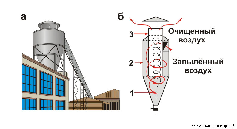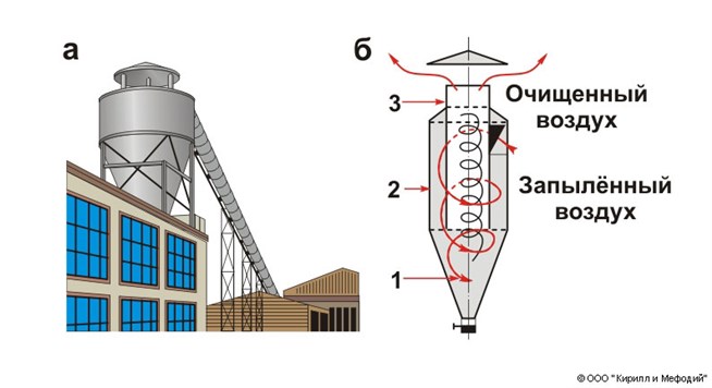 Циклон: а — общий вид; б — схема; 1 — коническая часть корпуса; 2 — цилиндрическая часть корпуса, образующая кольцевое пространство; 3 — выходная труба; 4 — металлический зонт.