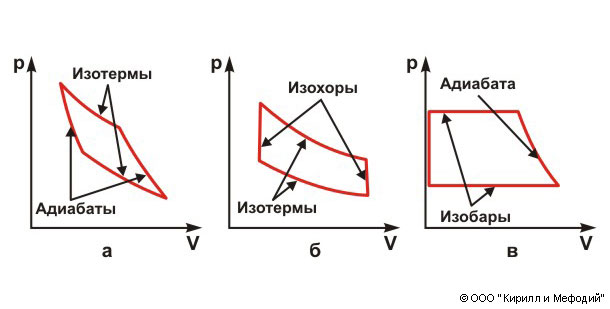 Термодинамические циклы в системе координат объем (V) — давление (r): а — Карно; б — Клайперона; в — Клаузиуса-Ранкина.