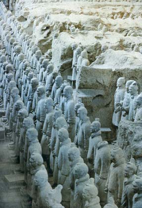 К строительству погребального комплекса Цинь Шихуанди были привлечены сотни тысяч людей. Огромное пространство вокруг погребального холма (на расстоянии полутора километров) заполнили подземные коридоры. В них разместилось 6-тысячное керамическое войско охранителей могилы.