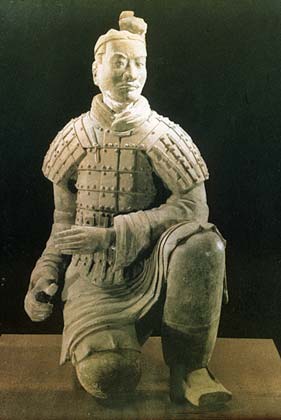 Погребальный комплекс Цин Шихуанди. Статуи керамического войска изготовлены в отжимочных формах и раскрашены в натуральные цвета. На фотографии изображена фигура солдата, припавшего на одно колено и готовящегося сразить невидимого врага.