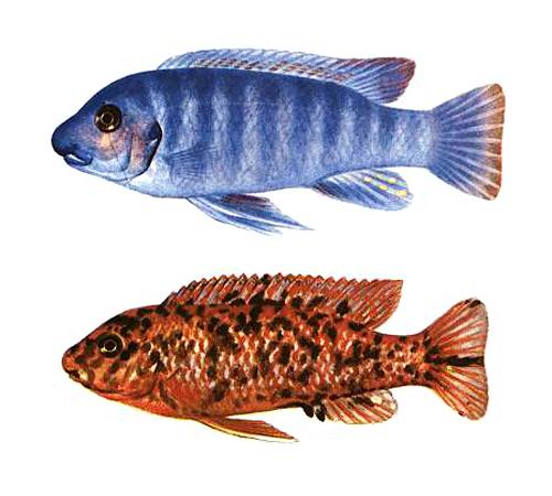 Цихлида-тапир может иметь разнообразную окраску. Вверху самец, внизу самка.