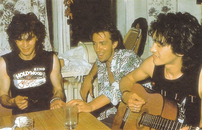 Виктор Цой (справа), Юрий Каспарян (слева) и Сергей Курехин в квартире Александра Липницкого. 1986 год. Фото из фотоальбома Джоанны Стингрей «Red Wave Presents Виктор Цой»