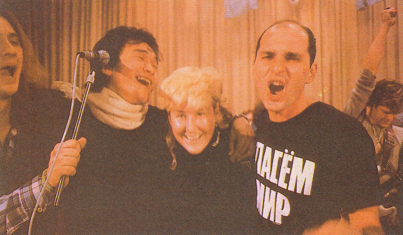 Виктор Цой, Джоанна Стингрей и Виктор Сологуб во время выступления в рок-клубе. г. Санкт-Петербург, 1986 год. Фото из фотоальбома Джоанны Стингрей «Red Wave Presents Виктор Цой»