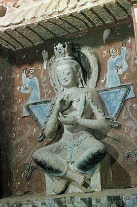 Скульптура Будды в пещерном храме монастыря Цяньфодун (Пещера тысячи будд), расположенном в провинции Ганьсу на западе Китая. Монастырь начал строиться в 4 веке.