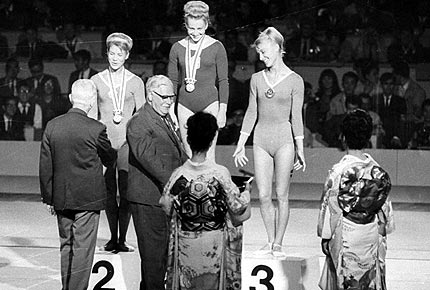 Пьедестал почета состязаний по спортивной гимнастике среди женщин на XVII Олимпийских играх в Токио (1964). Абсолютная чемпионка в многоборье — Вера Чаславска, серебряный призер — Лариса Латынина, бронзовая медаль у Полины Астаховой.