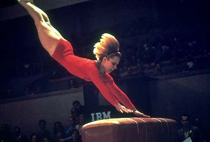 У олимпийской чемпионки Веры Чаславской не было слабых мест, но опорный прыжок ей удавался лучше других снарядов. На снимке: опорный прыжок на Олимпиаде в Мехико (1968).