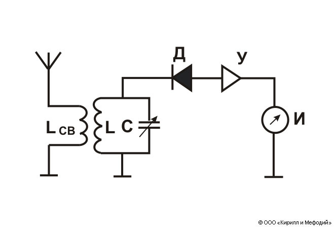 Схема электрического резонансного частотометра: Lсв — петля (виток) связи; LC — колебательный контур (C — калиброванный конденсатор переменной емкости, L — катушка индуктивности); Д — детектор (полупроводниковый диод); У — усилитель; И — индикатор (микроамперметр, милливольтметр).