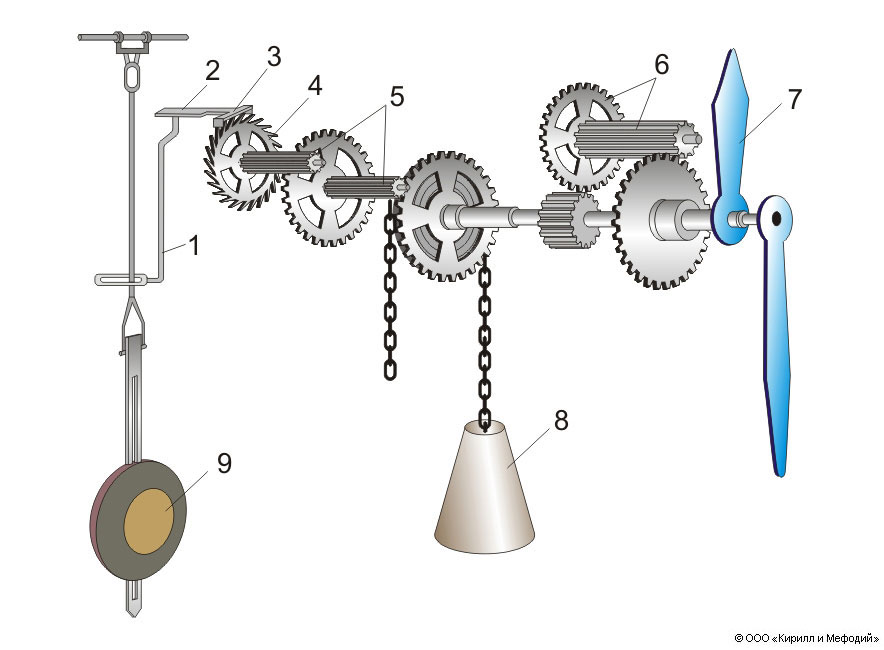 Схема механизма маятниковых часов с крючковатым спуском: 1 — поводок; 2 — ось скобы; 3 — скоба; 4 — спусковое колесо; 5 — основная колесная передача; 6 — колесная передача стрелок; 7 — стрелки; 8 — гиревой привод; 9 — маятник.