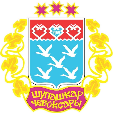 Большой герб города Чебоксары представляет собой серебряный пересеченный щит французской формы, разделенный на главу и основание. В лазоревом поле основания пять серебряных уток, летящих конвертом. В червленном поле главы, отделенном от основания зигзагообразной линией (символ Волги), три серебряных стилизованных под чувашский орнамент символов дубов. Внутреннее поле двух крайних дубов червленое, поле среднего силуэта — лазоревое, на нем серебряное число 1469 — дата первого летописного упоминания Чебоксар. Щит герба увенчан тремя четырехлучевыми восьмиугольными пурпуровыми окаймленными золотом звездами и обрамлен симметричным стилизованным орнаментальным декором (хмель) золотого цвета, замкнутым внизу девизным картушем с надписью в две строки «Шупашкар — Чебоксары» на пурпурном поле.