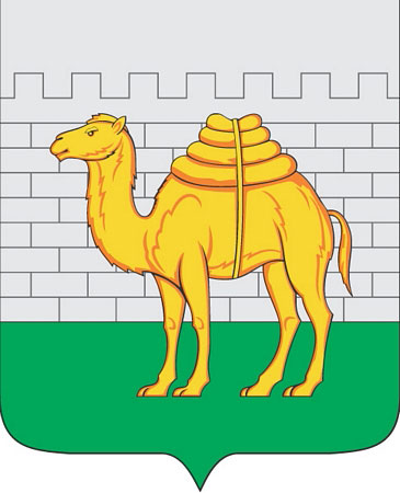 Герб Челябинска, принятый 12 сентября 2000 года. На фоне серебряной стены золотой навьюченный верблюд на зеленой земле. Герб Челябинска создан на основе исторического герба 1782 года.