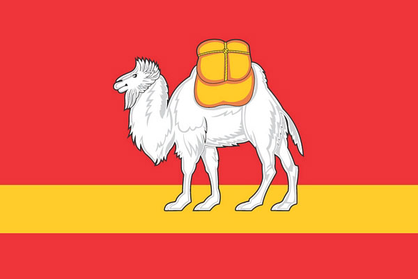 Флаг Челябинской области был принят 8 января 2001 года. Посреди полотнища изображение навьюченного белого двугорбого верблюда с желтой поклажей. Желтая полоса на флаге символизирует Уральские горы.