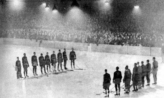 Чемпионат мира в Праге впервые выигрывает команда США «Бостон Олимпикс», которая обыграла в финале канадцев со счетом 2:1. На снимке: перед финальным поединком США:Канада.
