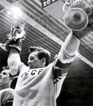 В 1963 после девятилетнего перерыва советская сборная снова чемпион мира. На снимке: капитан сборной Борис Майоров с Кубком, вручаемым за победу на мировом первенстве.