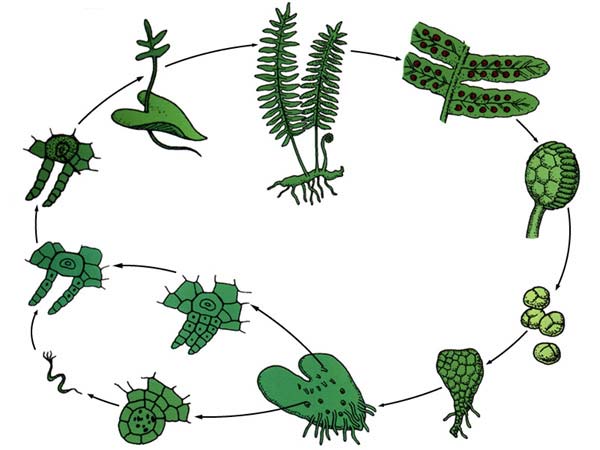 На нижней стороне листа в спорангиях у папоротников образуются споры. Из них во влажной среде развиваются заростки, на которых формируются половые органы. После оплодотворения из зиготы образуется зародыш, дающий начало новому растению.