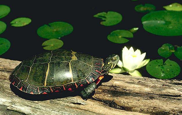 Расписная черепаха (Chrysemys picta) широко растпространена от Южной Канады до Северной Мексики. В длину не превышает 18 см.