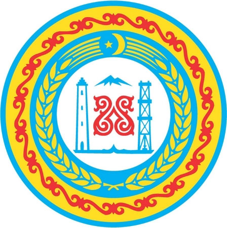 Герб Чеченской Республики, принятый 22 июня 2004 года. Во внутренней части белого круга — элемент чеченского орнамента, окрашенного в красный цвет. Стилизованные горы, историческая башня вайнахов и нефтяная вышка окрашены в синий цвет. Желтые колосья пшеницы на синем фоне симметрично обрамляют внутренний круг. В верхней части колосья венчают полумесяц и звезда. На внешнем круге национальный орнамент.